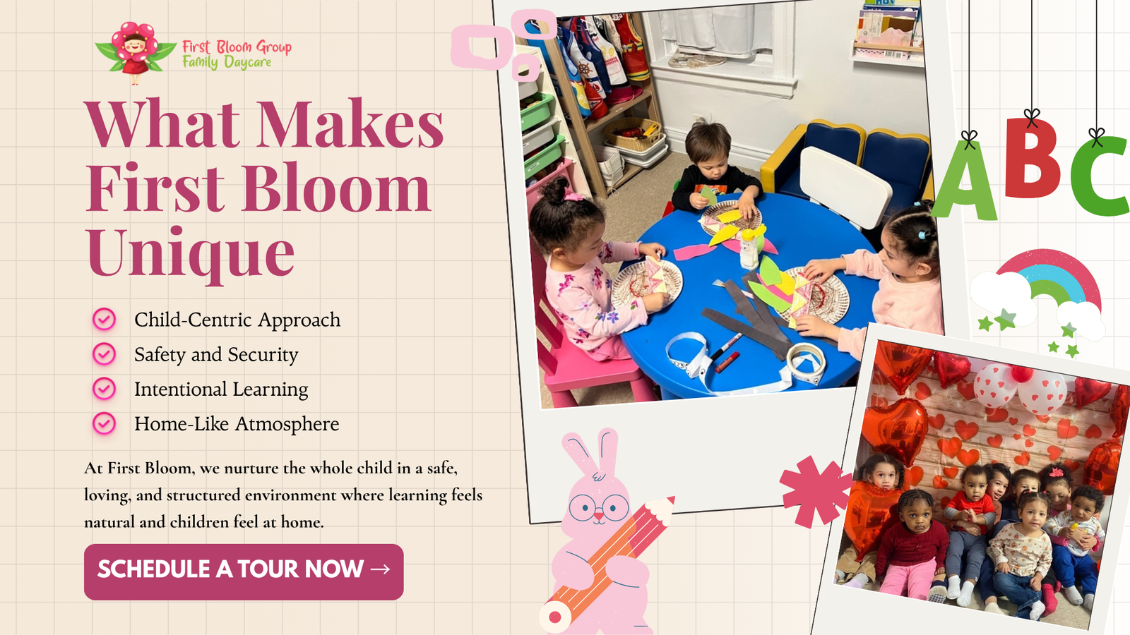 We strive to make First Bloom Daycare an extension of each child’s home, where they feel a sense of comfort, warmth, and belonging.